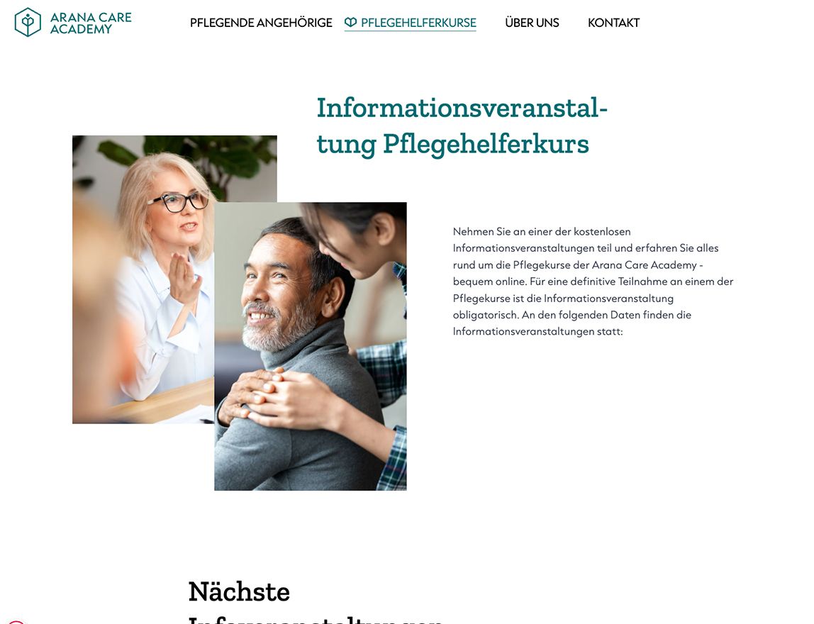 Ein zentrales Element der Plattform sind die Kurs- und Akademieangebote, die Arana Care im Rahmen seiner ganzheitlichen Betreuung nutzt. Die Angebote richten sich an Privatpersonen die Angehörige pflegen, aber auch an Institutionen. Die Ausbildung findet sowohl in Präsenz als auch Online statt. Zur Abwicklung wurden umfangreiche mehrstufige Prozesse implementiert.