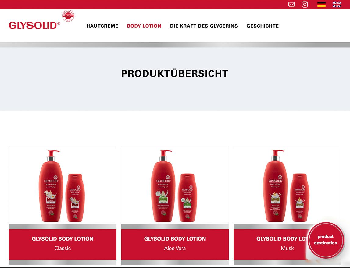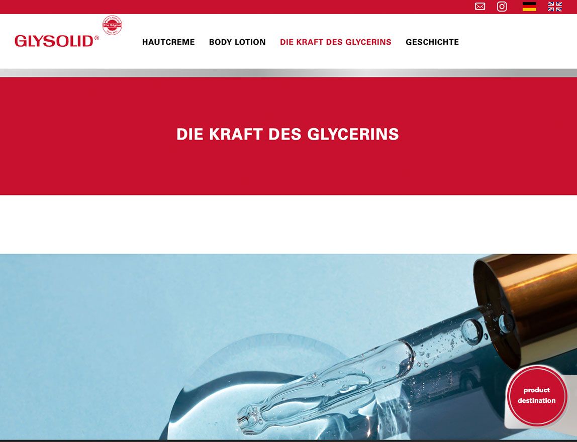 Die Produktdarstellung auf der Website überzeugt durch Übersichtlichkeit und Detailtiefe. Jedes Glysolid-Produkt wird klar präsentiert, sodass Besucher schnell das Passende finden. Besonders hervorzuheben ist die transparente Darstellung der Inhaltsstoffe: Sie ermöglicht einen genauen Einblick in die Pflegeformeln und unterstreicht das Vertrauen in die bewährte Qualität von Glysolid.