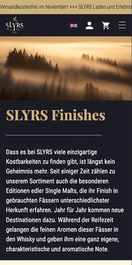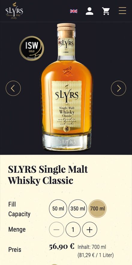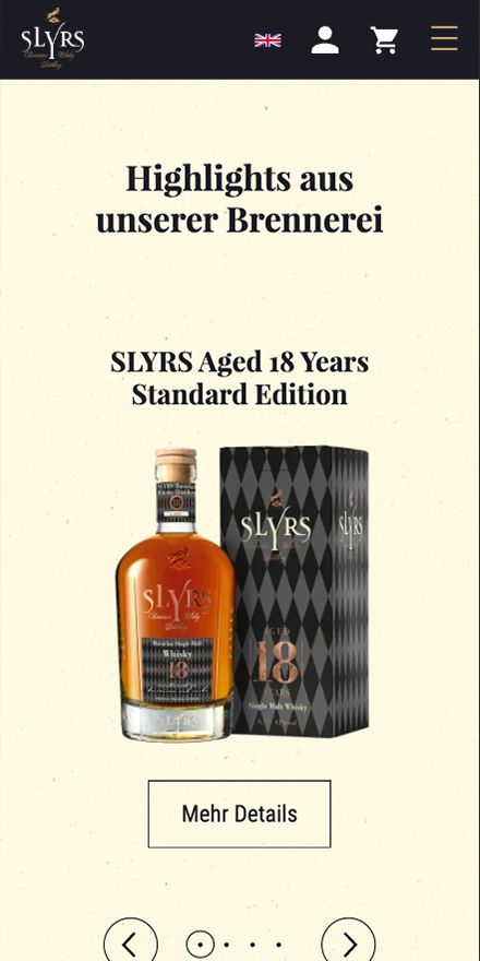 Zentrale Inhalte wie Produktbeschreibungen, Tasting Notes oder die Markenstory werden in einem klar strukturierten, ansprechenden Layout präsentiert, das Orientierung schafft und den Nutzer intuitiv führt. Hochwertige Bildwelten und eine durchdachte Interaktionsgestaltung formen ein digitales Erlebnis, das Qualität, Tradition und Exklusivität widerspiegelt – und Besucher emotional in die SLYRS Markenwelt eintauchen lässt.